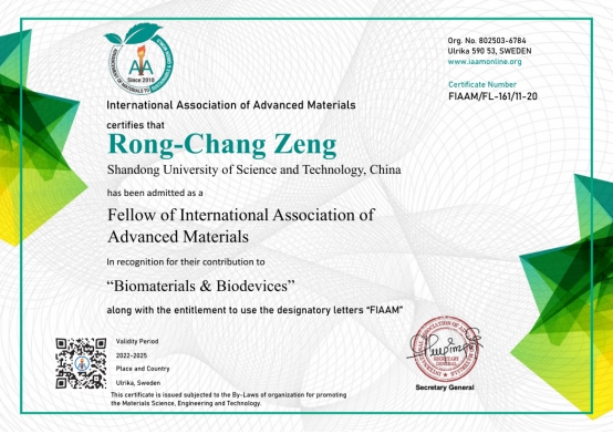 11月7日国际先进材料学会(International Association of Advanced Materials,IAAM)在美国迈阿密举办的美国先进材料大会(American Advanced Materials Congress)上授予公司威廉希尔williamhill官网曾荣昌教授“国际先进材料学会会士”(FIAAM)称号,以表彰他在“生物材料与生物器件”领域所做出的突出贡献。曾荣昌教授受邀做了题为 “Advance in Corrosion and Surface Modification of Bio-Magnesium and its Alloys”(生物镁合金腐蚀和表面改性进展)的在线大会特邀报告。