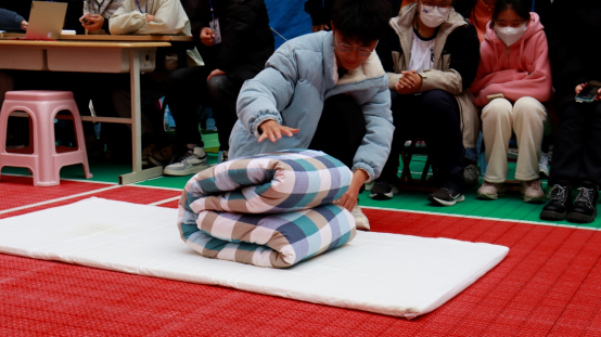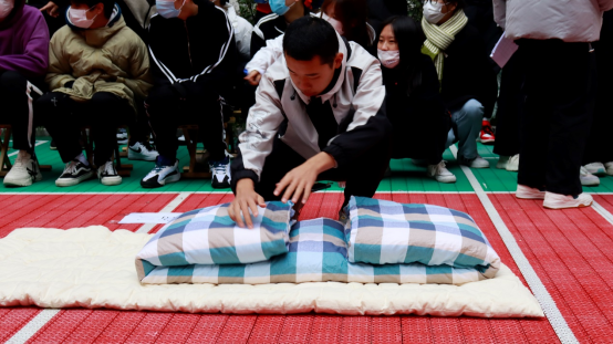 动员会后,叠被大赛正式开始。叠被大赛分为“小试身手”、“互帮互助一起来”、“迎难而上”等环节,总共十支队伍参加。各班同学们赛前口号响亮,人人斗志昂扬,参赛人员沉着冷静,赛时动作行云流水,叠被时一气呵成。经过激烈的角逐与比拼,最终金属3班荣获一等奖,金属1班与高分子3班荣获二等奖,金属2班、4班与新能源2班荣获三等奖,新能源1班等4个班级荣获优秀奖,金属2班荣获最佳班级文明风貌奖。