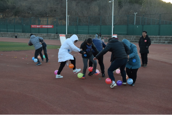 竞赛活动包含两部分内容,一是党的二十大精神知识竞答,二是趣味竞赛活动,其中包括举步维艰、你投我接、众人大跳绳、投弹打靶、篮球罚球、三人四足接力跑、运粮食和智勇大比拼八个竞赛项目。活动中,老师们随机组成参赛队伍,秉承着“友谊第一、比赛第二”的体育精神,全身心投入到活动中,队员之间互相加油打气,现场氛围热烈,欢声不断。在现场服务的员工会素质拓展部的工作人员也被老师们的热情感染,李洪旭同学说到:“在活动中看到了老师们的另一面,被他们团结协作认真比赛的热情鼓舞,听到老师们爽朗的笑声都不觉得天气寒冷了”。