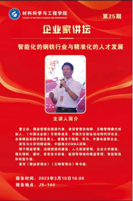 3月10日下午,公司举办第25期企业家讲坛,精益管理实践派代表,资深管理咨询师、五略管理模式创始人、《中国冶金报》专家库成员、中国大住宿业论坛特约评论员,永锋精益实践学院负责人董立杰应邀在J9-144会议室进行以《智能化的钢铁行业与精准化的人才发展》为题的报告。报告由威廉希尔williamhill官网经理李辉平主持,金属系主任孙金全、22级金属系全体本科生共计130余人参加。